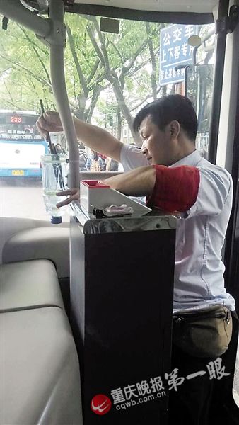 重慶晚報(bào)記者從前門(mén)上車(chē),一眼就看見(jiàn)門(mén)柱上綁一個(gè)小號(hào)飲料瓶,票箱旁綁著一個(gè)大號(hào)飲料瓶,瓶子被白色扎帶和膠皮管牢牢系住,瓶口向下,瓶子底部被剪開(kāi)朝上。大號(hào)瓶里有兩條小金魚(yú),正歡快地游著。