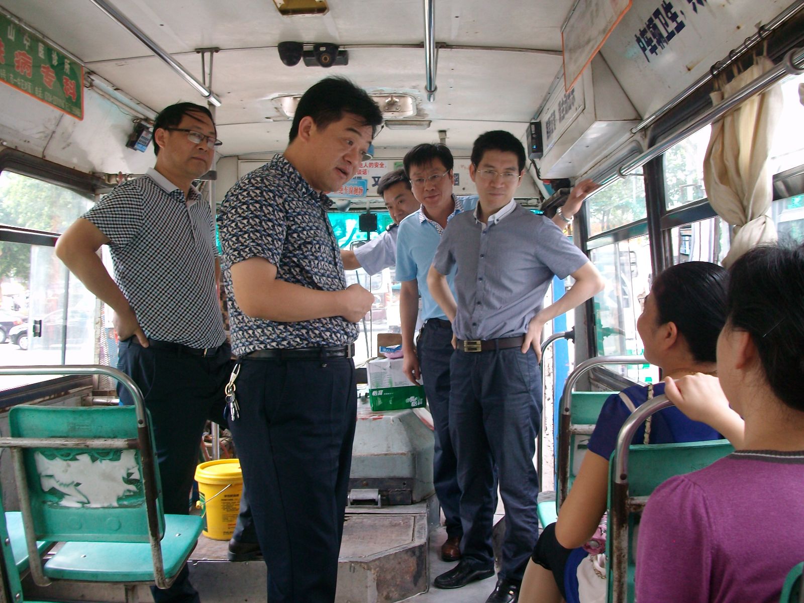當(dāng)日中午12時,正值高溫時刻,伍應(yīng)彪等領(lǐng)導(dǎo)冒著炎炎夏日來到?;圮囌荆赐繂柛邷叵聢允毓ぷ鲘徫坏墓宦毠?。在16路、21路、22路線正待發(fā)班的公交車前,伍應(yīng)彪上車與一線駕駛員親切握手,詢問了解駕駛員們的身體和工作情況,并聽取了一公司負(fù)責(zé)人對改善職工們的工作和休息環(huán)境等工作匯報。在與駕駛員們親切交談中,伍應(yīng)彪親自為駕駛員們送上了礦泉水、毛巾、人丹、清涼油等防暑降溫用品。同時,他還向部分乘客征求了改善乘車環(huán)境的意見和建議。